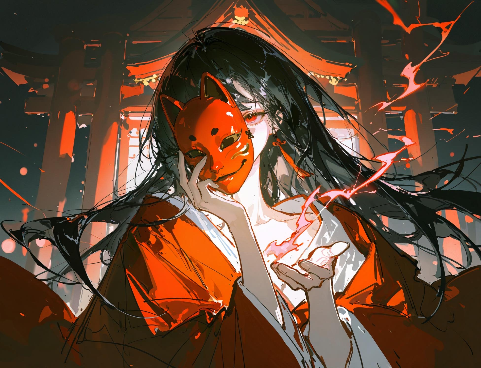 神力を帯びた: 赤い狐の仮面を常に付けている