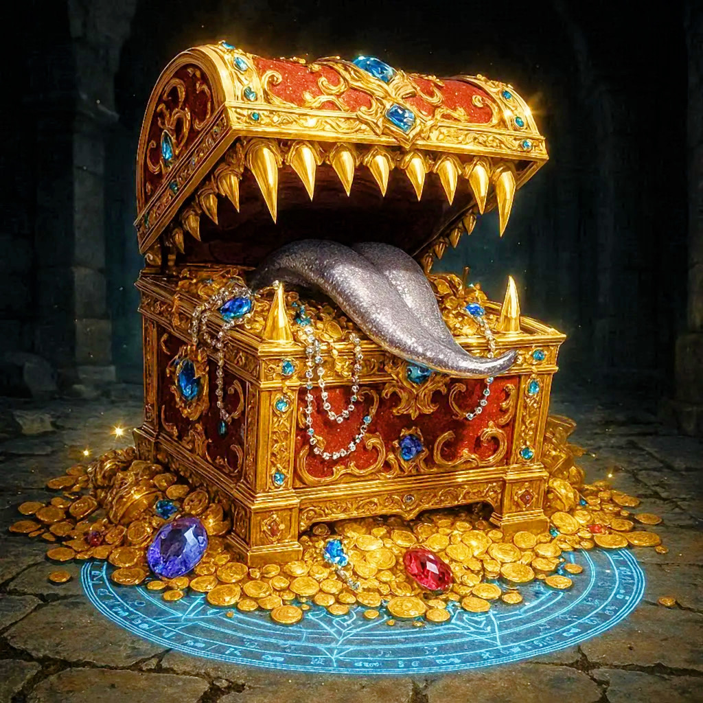 見た目: 黄金の宝箱型の魔物、金銀財宝が溢れ出る