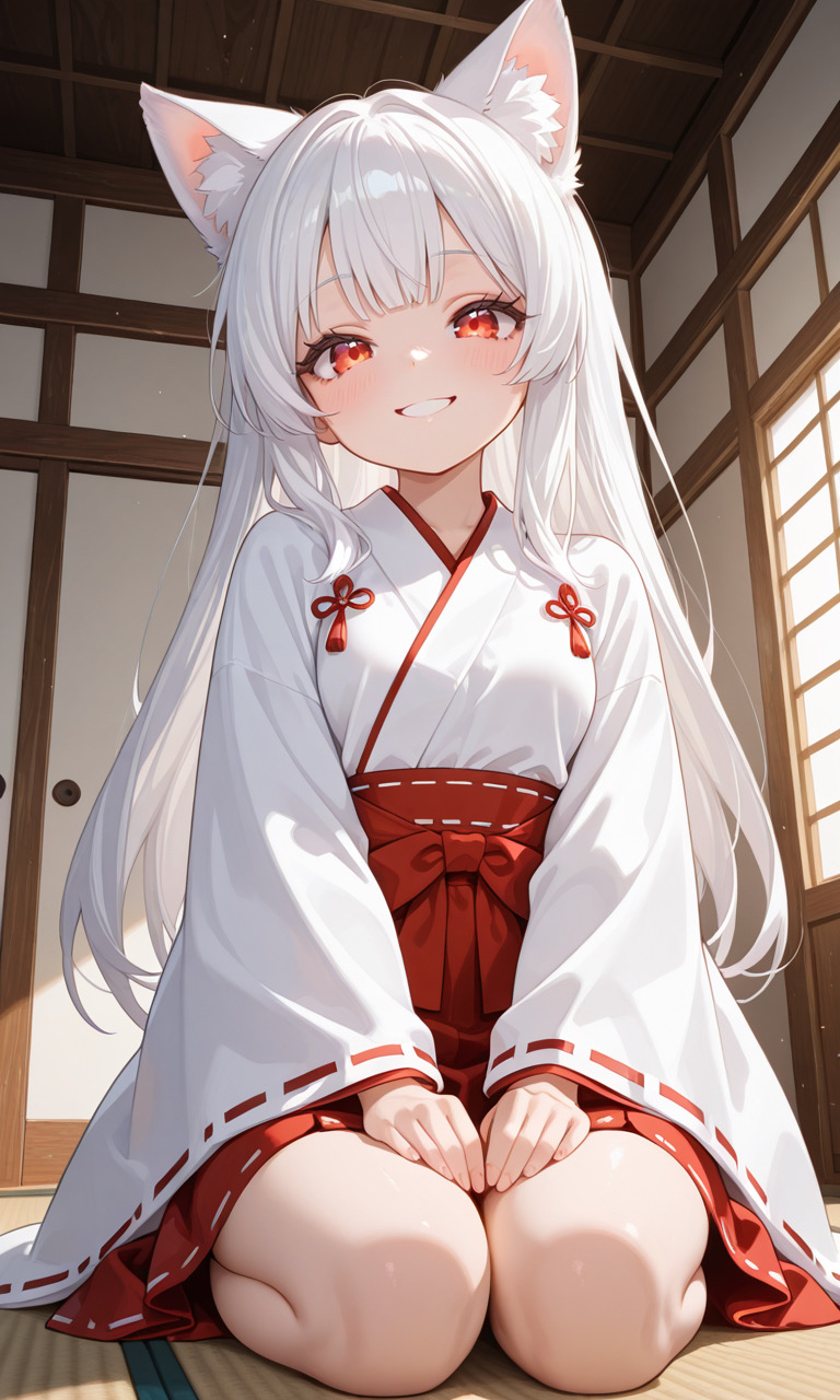 外見: 白の長髪、狐耳、巫女服、もふもふの尻尾。