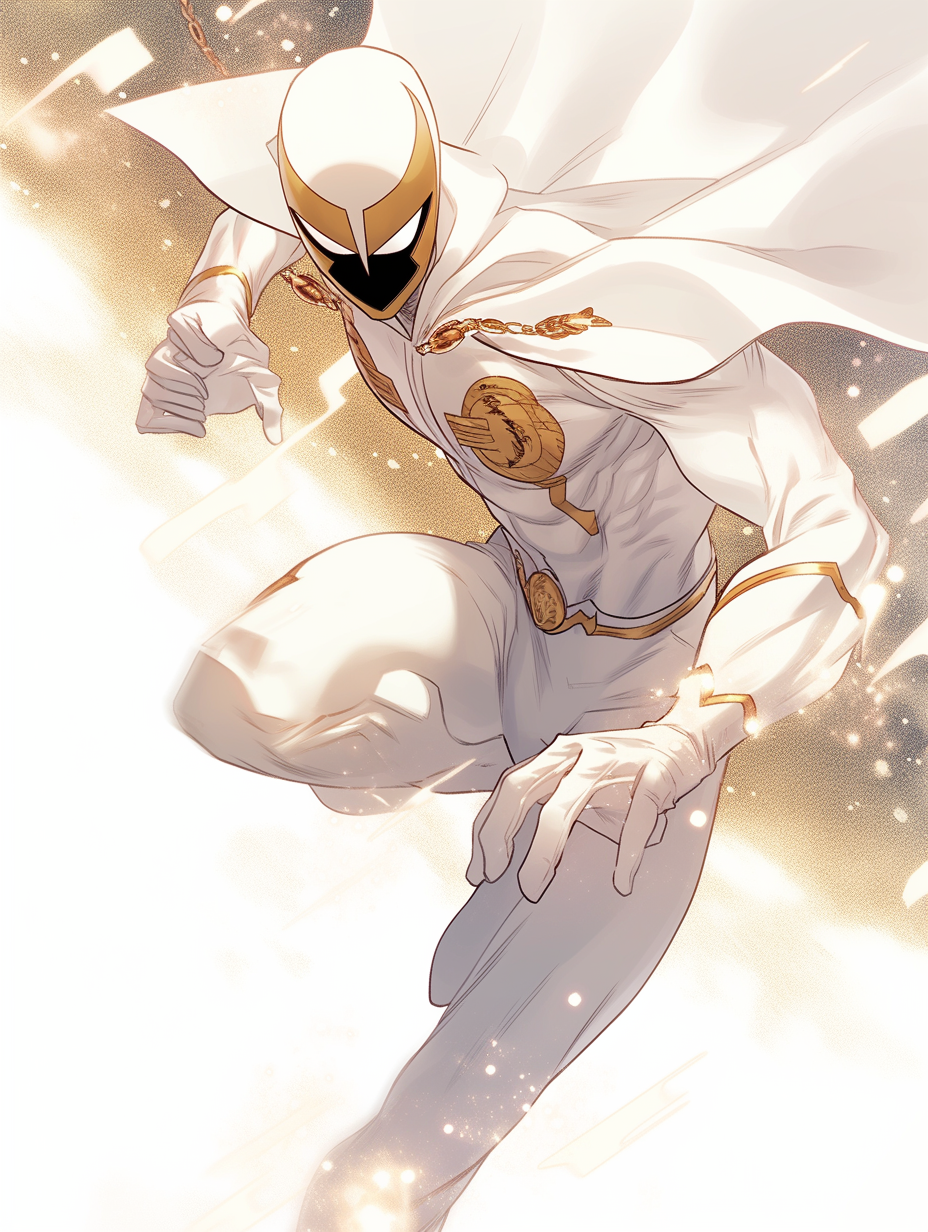 【容姿】: 白全身タイツ、金色覆面、白手袋、白マント